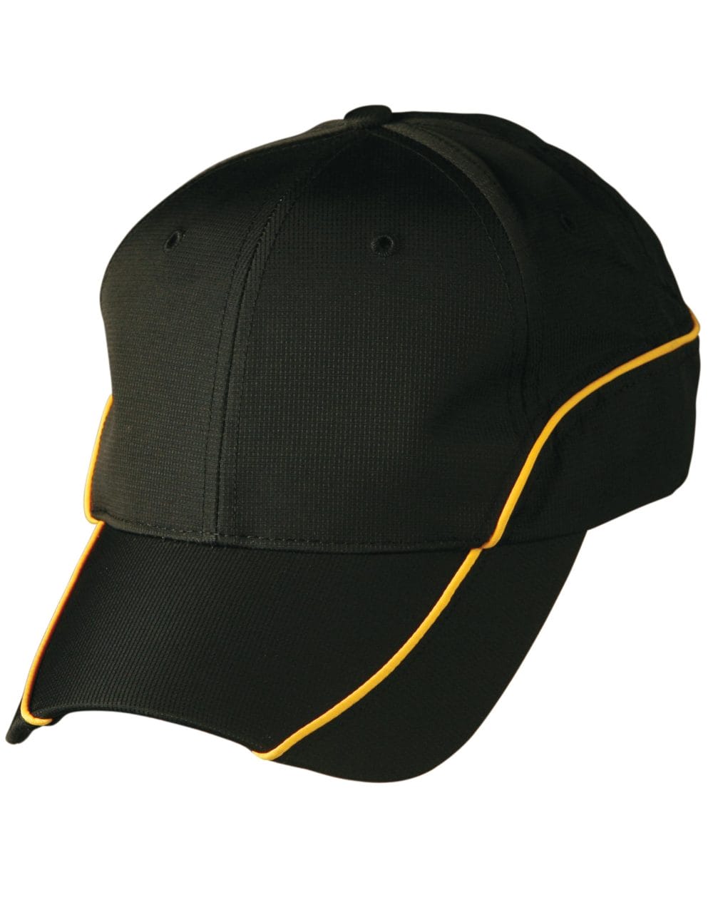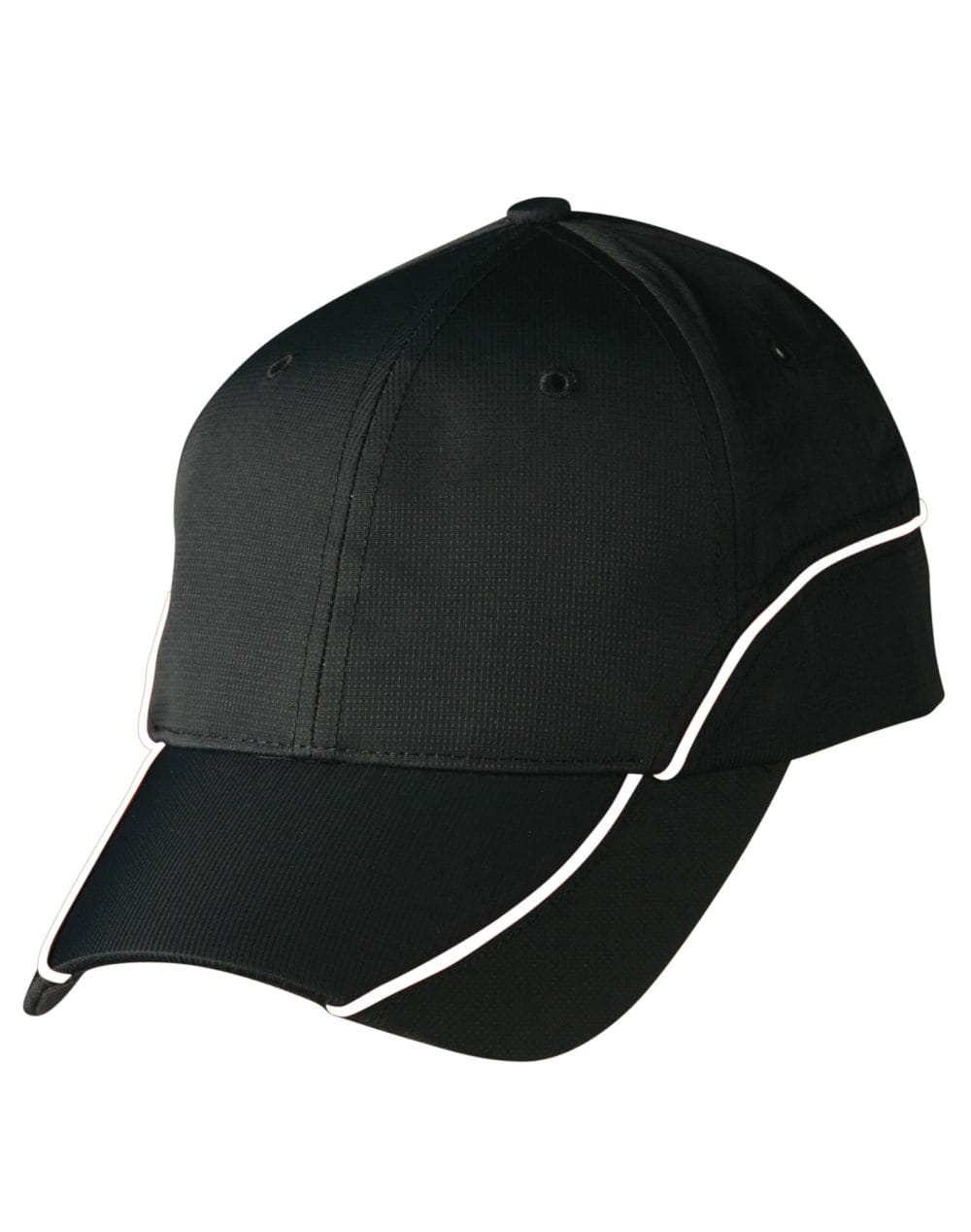 Description: 6 panel structured laid back front. Ripstop with polyester mesh lining, contrast trim across peak & crown. Short velcro crossover.