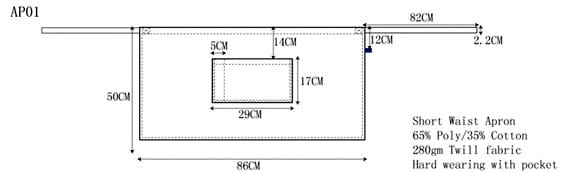 Description: Hard wearing with pocket & adjustable neck strap. Size: (w)86 x (h)50 cm.